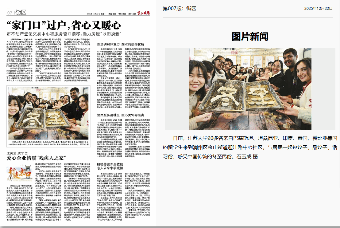 冬至将至,暖意先行。12月19日,我院组织来自巴基斯坦、坦桑尼亚、印度、泰国、赞比亚等国的10余名留学生走进镇江市润州区金山街道迎江路中心社区,与社区居民一同包饺子、话习俗,亲身体验中国传统节气文化,感受浓浓的中国温情。