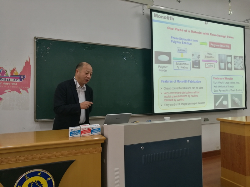 In his report, Prof. Uyama introduced a novel phase separation method to prepare a series of MONOLITH materials and their various applications including the purification of biological macromolecules. After the lecture, a lot of students discussed with Prof. Uyama and consulted the requirements of studying abroad.