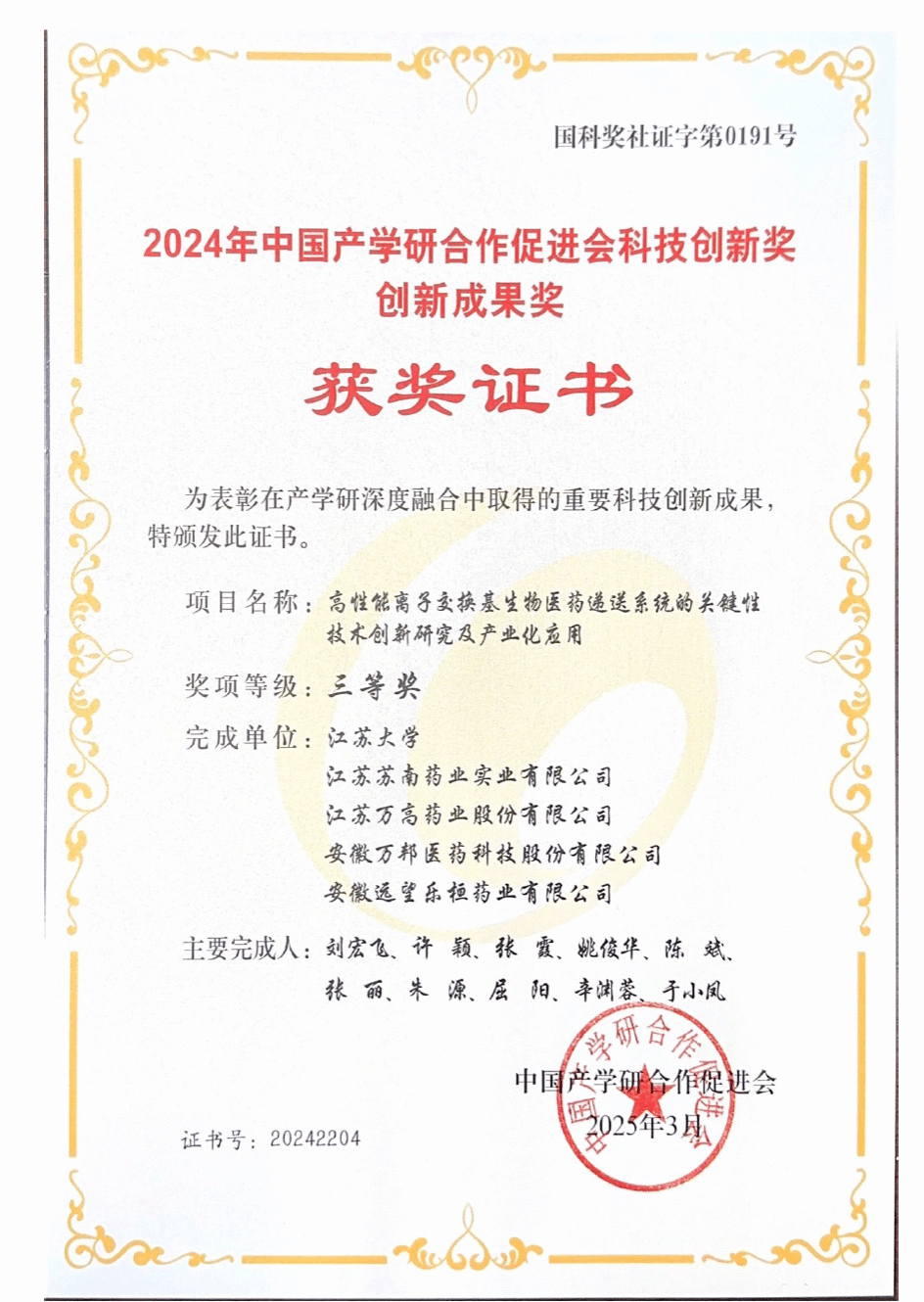 The research team led by Associate Professor Liu Hongfei from our institute, titled "Key Technological Innovation and Industrial Application of High-Performance Ion-Exchange-Based Biopharmaceutical Delivery Systems," won the 2024 China Industry-University-Research Cooperation Promotion Association Science and Technology Innovation Award (Third Prize), with Jiangsu University as the first completing unit.