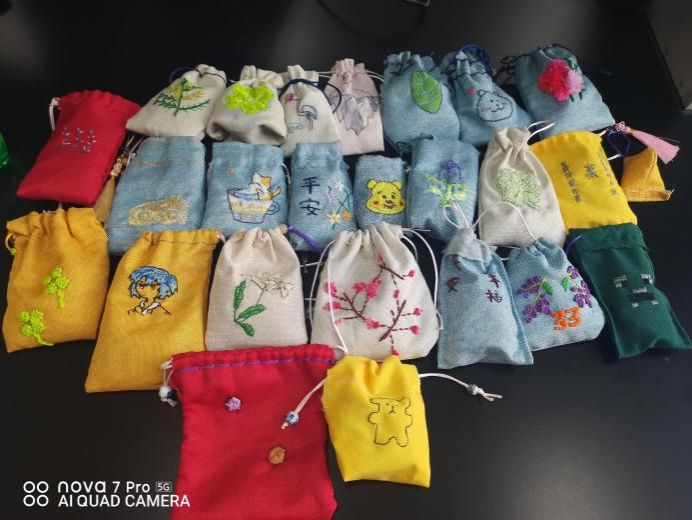4、劳动体验与创意结合:学生手绣香囊